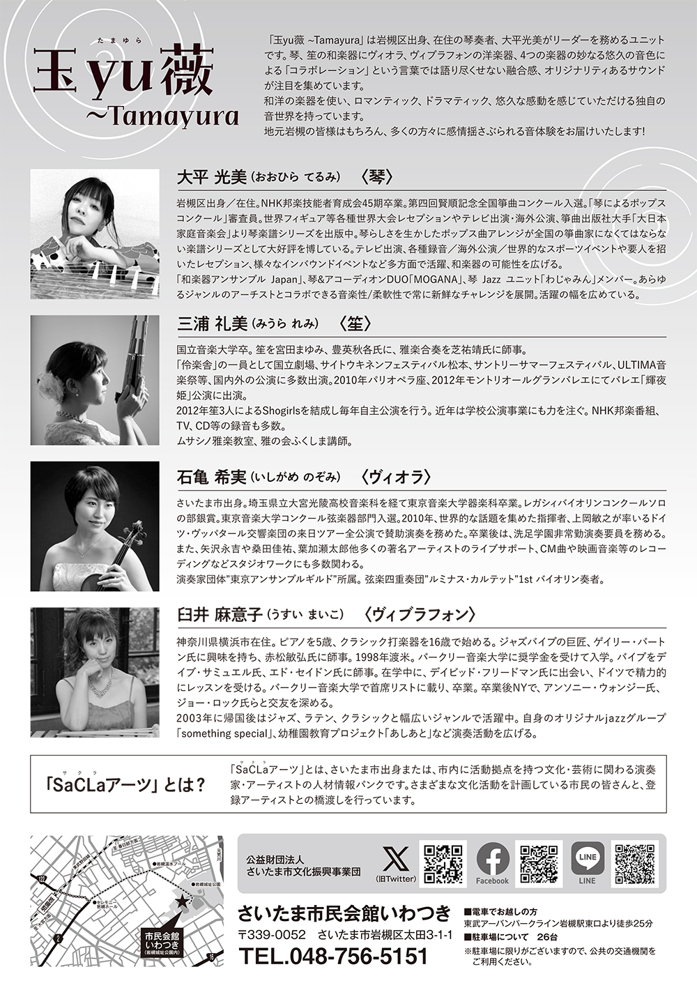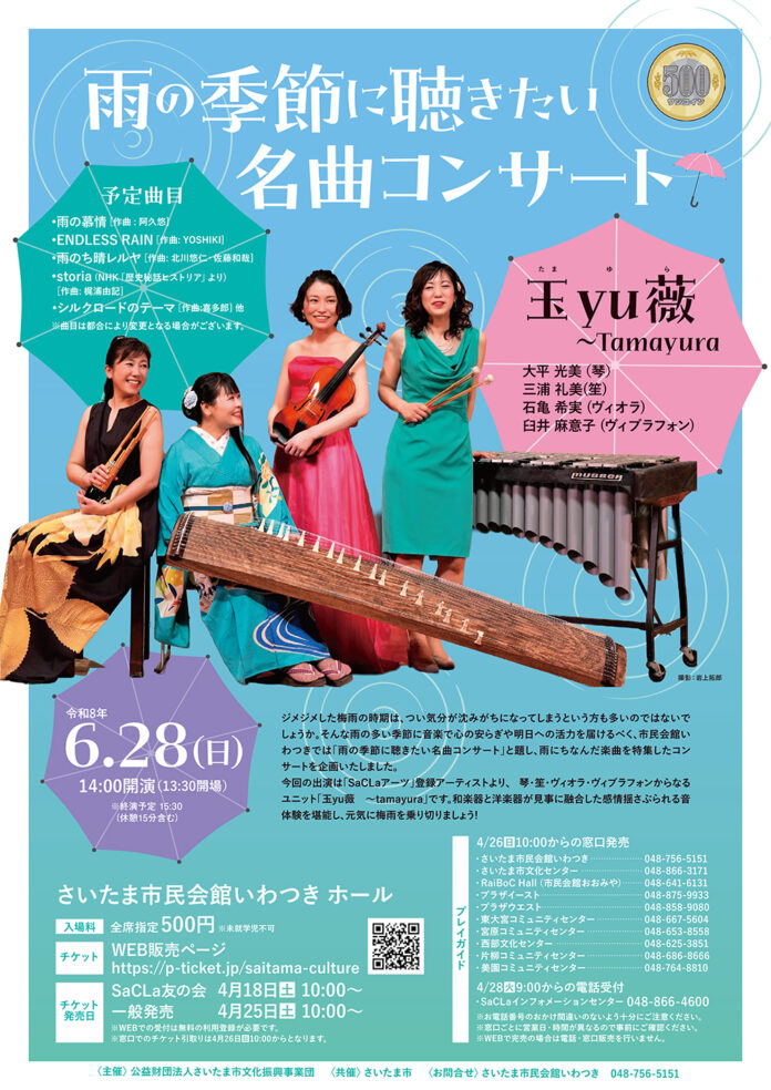 ジメジメした梅雨の時期は、つい気分が沈みがちになってしまうという方も多いのではないでしょうか。 そんな雨の多い季節に音楽で心の安らぎや明日への活力を届けるべく、市民会館いわつきでは「雨の季節に聴きたい名曲コンサート」と題し、雨にちなんだ楽曲を特集したコンサートを企画いたしました。 今回の出演は琴、笙、ヴィオラ、ヴィブラフォンからなるユニット「玉yu薇 ~tamayura」です。 和楽器と洋楽器が見事に融合した感情揺さぶられる音体験を堪能し、元気に梅雨を乗り切りましょう!