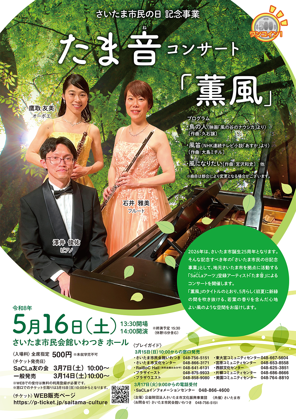 2026年は、さいたま市誕生25周年となります。 そんな記念すべき年の「さいたま市民の日記念事業」として、地元さいたま市を拠点に活動するユニット「たま音」によるコンサートを開催します。 「薫風」のタイトルのとおり、5月らしく初夏に新緑の間を吹き抜ける、若葉の香りを含んだ心地よい風のような空間をお届けします!