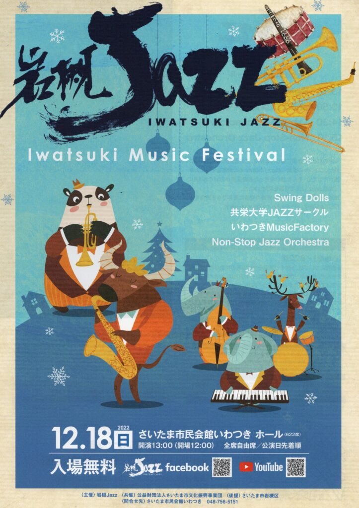 このフェスティバルは岩槻Jazzの集大成として12月第3土曜日に行っています。 Swong Dollsを始めとしたビッグバンド4バンドが「さいたま市民会館いわつき」で白熱の演奏を披露します。