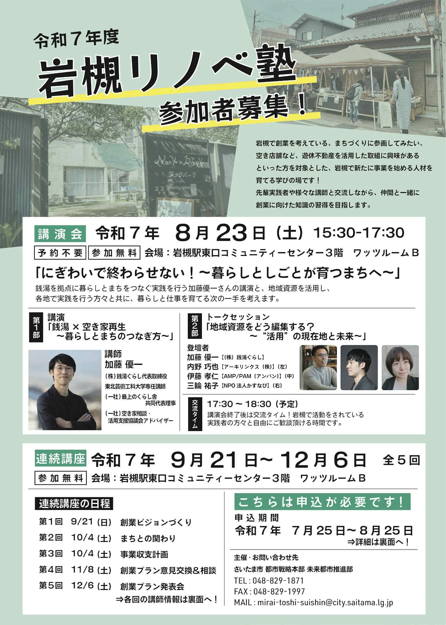 岩槻で創業を考えている、まちづくりに参画してみたい、空き店舗など、遊休不動産を活用した取組に興味があるといった方を対象とした、岩槻で新たに事業を始める人材を育てる学びの場です!